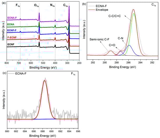 XPS survey spectra of ECNF, F-ECNF, ECNF-F, ECNA, ECNA-F (a), high-resolution C1s spectrum of ECNA-F (b), and high-resolution F1s spectrum of ECNA-F (c).