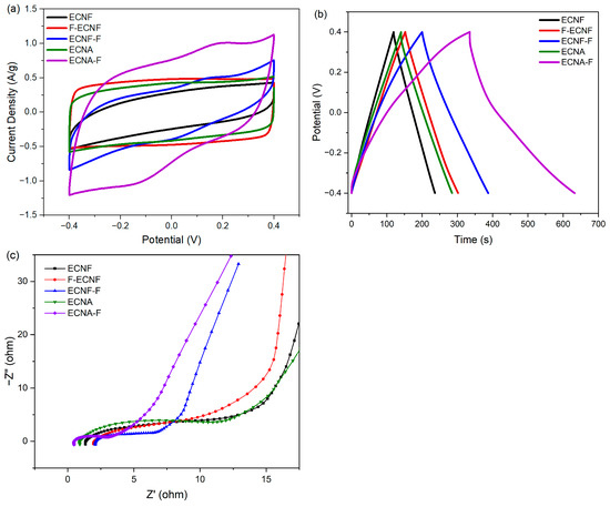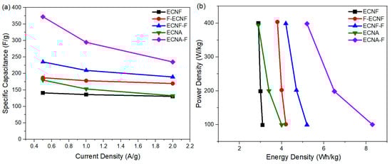 The dependence of specific capacitance of respective carbon nanofibrous electrode materials on current densities is shown in Figure 5a. By increasing the current density from 0.5 A/g to 2 A/g, the specific capacitance of all the carbon nanofibrous electrode materials was reduced. The specific capacitance of ECNF decreased from 141 F/g to 131 F/g when the current density increased from 0.5 A/g to 2 A/g, retaining 92% of its initial specific capacitance. By contrast, the specific capacitance of ECNA-F decreased to 235 F/g at a current density of 2 A/g, retaining 63% of its initial specific capacitance. The Type II HF acid treatment, as well as aerogel formation, resulted in more sensitivity to the current density. This phenomenon could be attributed to the large micropore volumes of ECNA and ECNA-F. Under low current density, electrolyte ions have enough time to access the micropores, while under high current density, the electrolyte ions would not have enough time to access the micropores, and the electrode material thus showed more reduced specific capacitance.