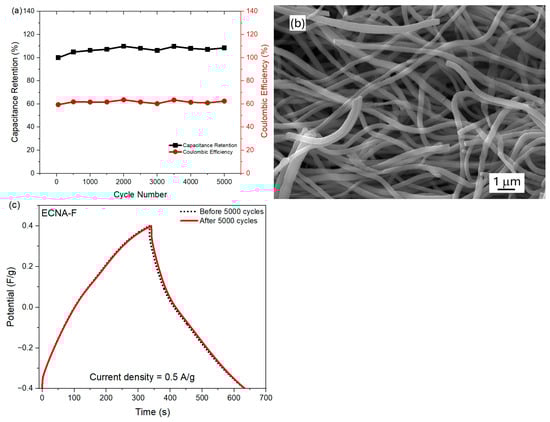 Furthermore, the cyclic stability of fluorinated carbon nanofibrous aerogel electrode material (ECNA-F) in the two-electrode cell was measured at a current density of 10 A/g (Figure 6a). ECNA-F exhibited outstanding stability in the cell by showing no loss in capacitance as well as maintaining a coulombic efficiency of ~62% after 5000 cycles, indicating its long-term stability as electrode material. The relatively low Coulomb efficiency could be attributed to the large micropore volume of the electrode material. During the charging time, it took more time for electrolyte ions to transport and access all the available surfaces, including micropores of the electrode material, while the electrolyte ions in micropores might not be fully recovered during the discharge process. The SEM examination revealed that there was no significant change in the morphology of ECNA-F after 5000 charge/discharge cycles (Figure 6b). Additionally, GCD tests of the cell with ECNA-F at 0.5 A/g before and after 5000 charge/discharge cycles demonstrated a capacitance retention of 98% (Figure 6c).