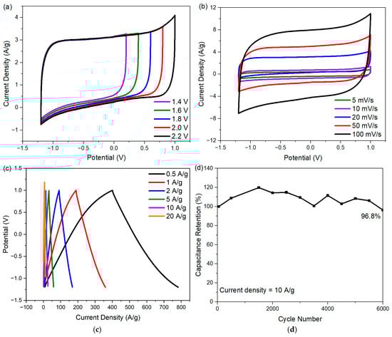 To improve the energy density of the cell with ECNA-F electrode material, Na2SO4 electrolyte was used. The choice of Na2SO4 is due to the strong solvation of both Na+ and SO42− ions in an aqueous medium, giving it the capability to be used with a wider potential window [22,23]. The CV curves of the cell with ECNA-F at different potential windows (1.4 to 2.2 V) are shown in Figure 7a. The ECNA-F electrode material could reach a 2.2 V potential window without distortion in the rectangular shape of its CV curve, indicating no oxygen and hydrogen evolution. According to the CV tests of ECNA-F at scan rates from 5 to 100 mV/s within a potential window of −1.2 to 1.0 V (Figure 7b), the CV curves retained their quasi-rectangular shape even at high scan rates, indicating outstanding electrochemical performance. The GCD curves of ECNA-F (Figure 7c) demonstrated perfect symmetry, implying good reversibility. The ECNA-F electrode material possessed a specific capacitance of 173 F/g at a current density of 0.5 A/g with 1 M Na2SO4 electrolyte, and 54.5% of the initial capacitance was retained when the current density was increased to 20 A/g. A 96.8% cell capacitance retention was achieved after 6000 charge/discharge cycles at 10 A/g current density with ECNA-F electrode material and 1 M Na2SO4 electrolyte (Figure 7d). The relatively large fluctuation of specific capacitance during the cycling test could be attributed to the relatively slow charge transfer/ion migration in the porous electrode material and consequent variations in charge/discharge responses due to the relatively large hydration sphere radius and reduced ionic mobility and molar ionic conductivity of Na+ ions compared to H+ ions [24]. The cell with ECNA-F electrode material and 1 M Na2SO4 electrolyte achieved an energy density of 29.1 Wh/kg at a power density of 275 W/kg.