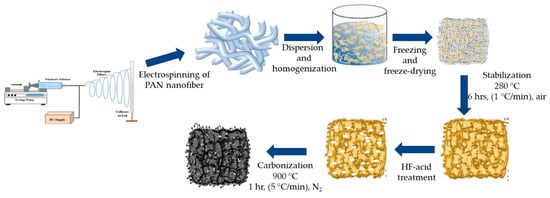 Carbon materials have been widely considered efficient electrode materials for supercapacitors due to their good conductivity, stability, and mechanical properties. Out of various ways of making carbon materials, the electrospinning method has gained much attention due to its simplicity in producing submicron and nanometer-scale carbon fibers, which demonstrated the virtues of high surface area and structural stability [10]. To further improve the electrochemical performance of electrospun carbon nanofibers, highly porous sponge-like materials with large volume-to-mass ratio, i.e., carbon nanofibrous aerogel materials, have been reported in recent years [11,12]. The high porosity and wide range of pore size distribution, like micropores and mesopores that are present in carbon nanofibrous aerogels, make them suitable as electrode materials for supercapacitors.