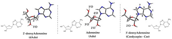 All nucleosides, which contain sugar and nucleobase moieties, exhibit high flexibility, with more than forty thousand different conformers possible for each canonical nucleoside [15]. A thorough structural analysis revealed that Cordycepin preferably adopts a 3′-endo,anti-conformation similar to that of Ado. In contrast, for dAdo2′-endo,anti was found to be energetically privileged (Table S1, Supplementary Materials).