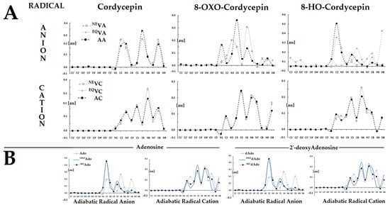 Similar findings were noted for the adiabatic radical cation and anion of canonical nucleosides, regardless of the presence of an additional oxygen atom in their structures (Table S2). This result indicates some similarity between Cordycepin and adenosine/2′-deoxyadenosine; however, a careful analysis of the spin distribution revealed differences (Figure 3).