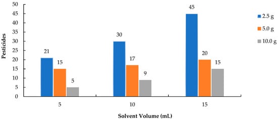 The number of pesticides extracted increased significantly with the addition of higher volumes of ACN across all sample sizes, as illustrated in Figure 1. In the 2.5 g sample, the number of detectable pesticides increased markedly from 21 (extracted with 5 mL of ACN) to 45 (with 15 mL of ACN), indicating that extraction efficiency improves with increased solvent volume. The 5.0 g and 10.0 g samples exhibited a similar trend, though their overall recovery rates were lower. Using a larger volume of solvent relative to the sample size is especially critical for smaller samples, as it facilitates the separation of lipophilic pesticide residues into the extraction solvent [20,21,22]. This study demonstrated that increasing the volume of ACN significantly enhanced the extraction efficiency of lipophilic pesticides. Similar to the findings of Shin et al. (2020) [19], who demonstrated that a solvent-to-sample ratio of 3:1 or greater substantially improved the recovery of lipophilic pesticides in mealworms, this study found that increasing the volume of acetonitrile led to a marked increase in the number of detectable analytes, especially in small sample sizes.