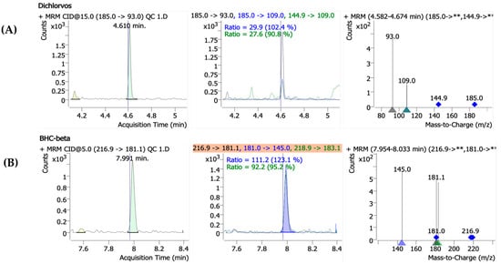Precursor ions were identified through full-scan analysis for each pesticide, and their retention times (RTs) were determined under the specified gas chromatography (GC) conditions. Product ion scans were then carried out at varying collision energies (0–50 eV) using the selected precursor ions. The optimal MRM conditions were established by evaluating the sensitivity of the resulting product ions at varying CE levels. For confirmation, two product ions per precursor, along with their ion ratios and retention times, were selected. The qualitative and quantitative ions were selected based on their signal intensity and minimal interference from surrounding ions or baseline noise, as detailed in Table 1, and Figure 2 shows the mass spectra of the representative pesticide standards obtained under collision-induced dissociation (CID) conditions, including the ion ratios for dichlorvos and β-BHC.