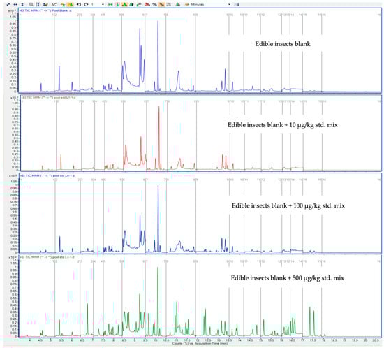 Reconstructed GC-MS/MS chromatograms of edible insects blank and edible insects blank fortified at 10, 100, and 500 μg/kg in 20 min analyses of 47 target compounds with 1 μL injection volume.