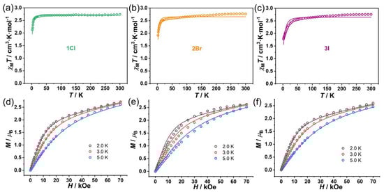 Temperature-dependent χMT data (a–c) and field-dependent magnetization data (d–f) of 1Cl (left), 2Br (middle), and 3I (right). Open circles and solid lines represent the experimental data and the fitting values using PHI, respectively.