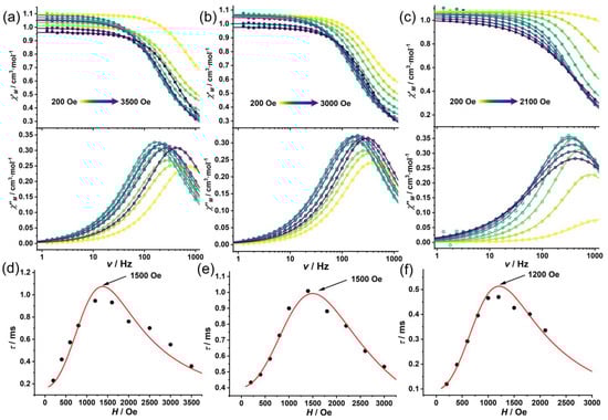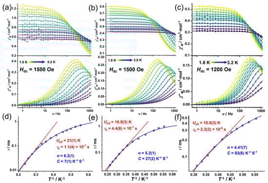 However, upon application of external DC fields, all three complexes displayed distinct temperature-dependent χ″M signals, demonstrating that the static magnetic fields successfully suppressed the QTM process (Figure 3). The frequency-dependent AC susceptibility data were simultaneously fitted with the generalized Debye model (Equations (S1) and (S2)) [47] to extract the spin–lattice relaxation times (τ) at different temperatures (Figure 3d–f).