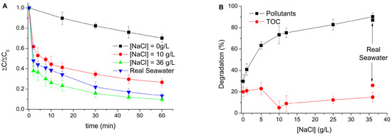For the sake of clarity, only four conditions are presented in Figure 1A: the absence of chlorides, chlorides at concentrations of 10 and 36 g/L, and real seawater as matrix. The total concentration was calculated as follows: the concentration of each compound in each sample was determined and then summed. The resulting values were normalized using the initial total concentration. The degradation of the mixture of pollutants was fast in the first stages of the process and the increase in chlorides concentration produced an increase in the initial rate of degradation and in the final degradation achieved. All final degradations achieved in every experimental condition are presented in Figure 1B. The degradation achieved was always higher when the presence of chlorides was increased. Thus, a continuous improvement of the degradation achieved was observed for the concentrations 0, 1, 2, 5, 10, 12, 25, and 36 g/L, and the experiments carried out with real seawater obtained results quite similar to those with 36 g/L. Contrary to the effect produced in other advanced oxidation processes, it seemed that an increase in chlorides concentration increased the efficiency of the pollutants degradation. However, the mineralization behavior did not follow a clear tendency.
