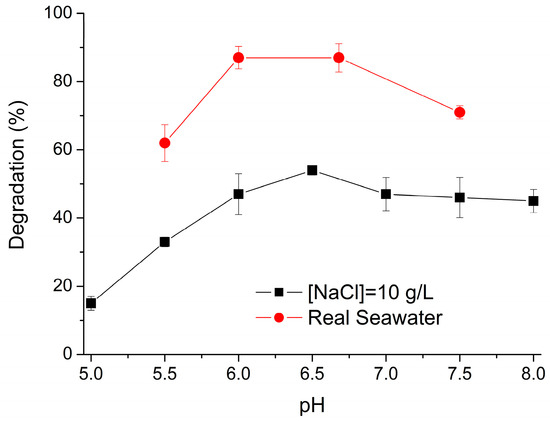 The effect of the chloride’s concentration was tested at the same initial pH and was kept free during the experiments. In order to find the optimum pH value for this process, the experiments were repeated at the fixed value of a NaCl concentration of 10 g/L in distilled water changing the initial pH from 5 to 8, and the same effect was studied with real seawater. As shown in Figure 2, there was a maximum degradation of the mixture of pollutants between 6 and 7 in both water matrices and it has to be highlighted that the natural pH of seawater (after the addition of pollutants and copper) was around 6.7, which corresponds to a value inside the optimum zone of work. At this point, it should be clarified that the original pH of seawater was 8.1 but the addition of the pollutants and the copper salts produced a decrease in this value.