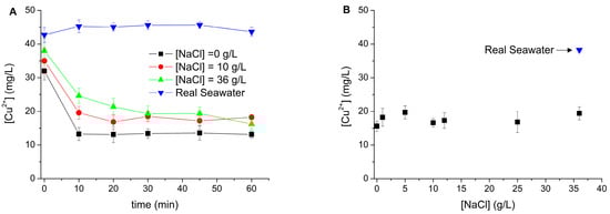 Results obtained with real seawater showed that the amount of copper in the solution remained very high, close to 40 mg/L, at the end of the reaction with a final pH value that also remained almost constant (as discussed in next section). Real seawater presents a variety of inorganic anions that could form copper complexes apart from chlorides; sulfates, bicarbonates, bromides, borates, or fluorides decreasing its precipitation rate as copper hydroxide. For example, the formation of active complexes of copper with bicarbonates was previously described [31] and the presence of natural organic matter such as humic acid could also form copper complexes slowing its precipitation [32].