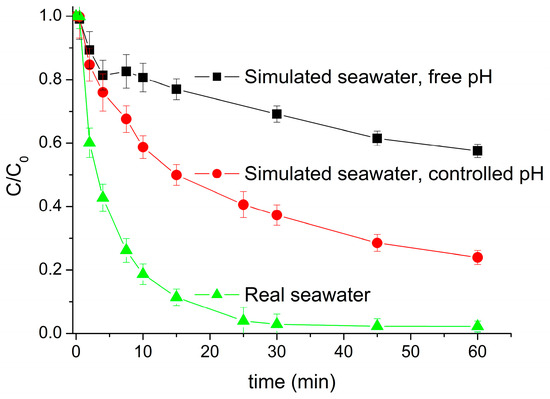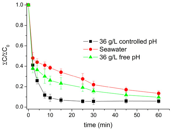Figure 5 shows the comparison of real seawater and simulated seawater when the pH was left free and when the pH was controlled. The positive effect of operating at an optimal pH throughout the entire process can be clearly seen in the degradation values achieved after 15 min of reaction. For this reaction time, the degradation achieved at a free pH is close to 75%, while at a controlled pH, this value rises above 90%.