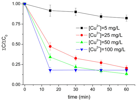 Since the degradation of the pollutants in real seawater was very fast and the presence of a buffered media preserves its activity, other amounts of copper in solution were tested to study the convenience of using lower amounts of the catalyst. Two values of concentration below the reference employed in all previous experiments (50 mg/L) and one value with concentration above the reference were performed in the same conditions of pollutants and hydrogen peroxide concentrations in real seawater at its natural pH. The evolution of the pollutants concentration during the experiment were represented as the sum of all of them, as can be seen in Figure 6.