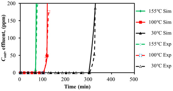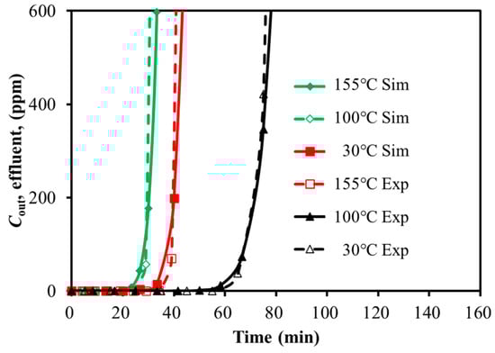 The single-component adsorption process of low-concentration SO2 or H2S over activated carbon was simulated by Aspen adsorption V11 [31]. The Langmuir adsorption isotherm equation was applied to model the adsorption bed, with the parameters of the adsorption bed (the diameter was 15 mm and the height was 75 mm) and the adsorbent being consistent with the experimental setup. The simulated breakthrough curves were compared with the experimental data to validate the isotherm model and its parameters.