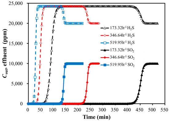 Under the conditions of the adsorption temperature of 30 °C, a total pressure of 101 kPa, and the inlet gas concentrations of 2% H2S and 1% SO2, the breakthrough curves for the bi-component SO2 and H2S adsorption on the activated carbon were simulated with the feed GHSV variation. The results are presented in Figure 6 and Table 7.