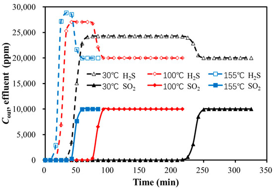 The dynamic adsorption experiments of SO2 or H2S were carried out under the adsorption conditions of 1% SO2 or 2% H2S, a GHSV of 173.32~866.58 1/h, and a temperature of 30 °C~155 °C.