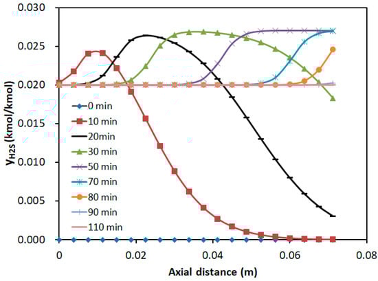 Under the adsorption conditions of a H2S concentration of 2%, SO2 concentration of 1%, temperature of 30 °C, and a GHSV of 259.98 h−1, the axial concentration distributions of the two components in the adsorption bed at different time intervals are illustrated in Figure 8 and Figure 9. The horizontal axis represented the axial distance from the inlet of the adsorption bed, while the vertical axis indicates the concentration of SO2 and H2S in the gas mixture.