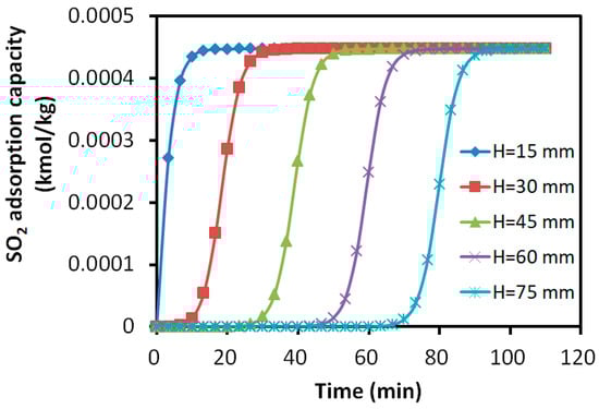 The axial distribution of the adsorption amounts for the bi-component SO2 and H2S over the activated carbon are shown in Figure 10 and Figure 11. The horizontal axis represented the adsorption time, while the vertical axis indicated the adsorption amount of each component. The parameter H denotes the axial distance from the inlet of the adsorption bed.
