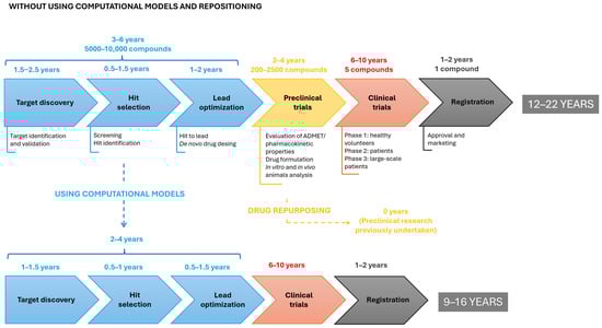 Duration of drug development from de novo synthesis compared to the use of computational methods and drug repositioning.