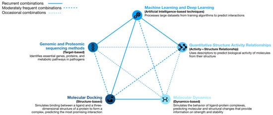 The main computational strategies for the discovery of new antimicrobials and their combinations. The combinations have been classified into 3 categories: the widely applied ones (solid line) are the most used because they are employed separately, and their results have a known criterion; the frequently applied ones (large dashed line), although they do not present as great a criterion as the previous ones, when combined, provide information that cannot be obtained with the separate methods; and the occasionally applied ones (small dashed line) are carried out for specific questions or needs of the study to be carried out (genomic data of interest or molecular structures that cannot be observed with more traditional computational models); however, they are young computational models with limited reliability.