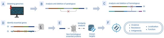 Graphical scheme of the steps commonly followed in the subtractive genomics approach. (A): Retrieval of interest and reference genomes from databases. (B): Removal of paralogous sequences in the genome of interest (GI). (C): Removal of homologous sequences to the reference genome (RG). (D): Compare non-homologous against database of essential genes to identify essential genes. (E): Identify and test for high similarity of non-homologous essential proteins to those found in databases of known targets. (F): Selection of targets of interest based on criteria of virulence, resistance, antigenicity, localization and function in the pathogen.
