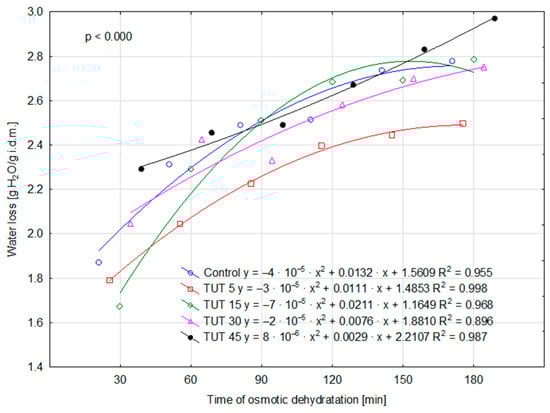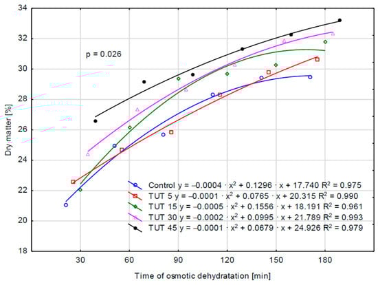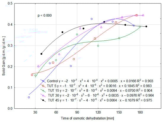 For the remaining parameters (WL, ML, and SG), the values determined for the control sample are higher—although not always statistically higher (SG parameter)—than those observed for the TUT 5 sample. This may suggest that a 5 min ultrasound treatment of the fruit resulted in a reduction in WL, MS, and SG values compared to those observed in the control sample. Therefore, it can be hypothesized that such ultrasonic treatment (TUT 5) may have led to an increase in cell wall impermeability, which, in turn, could be attributed to structural modifications primarily in cellulose and lignin. The performed analysis of variance also confirmed the statistical significance of the interaction effect between factors (TUT × TOD) for the parameters WL, SG, and DM (Figure 1, Figure 2, and Figure 3, respectively), as evidenced by the probability levels presented in the figures. Water loss over time was additionally illustrated using curves that account for the prior ultrasound treatment of the apples (Figure 1). Assessing the kinetics of this process, it can be observed that the shape of the four curves is similar, as they exhibit a negative polynomial slope coefficient. This indicates a deceleration in the dehydration process over time, both in cases where the fruits were not subjected to ultrasound treatment and those where they were treated for 5, 15, and 30 min. This decline is primarily attributed to structural changes in the tissue, as well as a decreasing osmotic pressure gradient between the dehydrated fruit and the surrounding osmotic solution over time [23]. The obtained findings are consistent with trends observed in other studies on osmotic dehydration processes. Brochier et al. [24], in their study on the osmotic dehydration of yacon roots in sorbitol, glycerol, and polydextrose solutions, also observed the highest rate of water loss at the beginning of the process. They emphasized that the increase in soluble solids occurred mainly within the first two hours of dehydration. Similarly, Wiktor et al. [9] reported a rapid initial water loss during the osmotic dehydration of organic strawberries in sucrose, sorbitol, and maltitol solutions. Cichowska et al. [13], on the other hand, found that during the osmotic dehydration of apples in 30% erythritol, xylitol, maltitol, and dihydroxyacetone solutions, solid migration into plant tissue continued even during the third hour of the process. However, according to their earlier research [25], particularly in erythritol and xylitol solutions, extending the process beyond three hours appears unnecessary, as further water loss in later stages does not differ significantly from that observed earlier. Ultrasound treatment of the fruit for 45 min altered the curve shape (positive polynomial slope coefficient), significantly increasing the rate of water loss over time. By the 180th minute of dehydration, this loss reached approximately 3 g H2O/g i.d.m. For the SG parameter, two polynomial functions had a positive slope coefficient (TUT 15 and TUT 45), while three exhibited a negative coefficient (control, TUT 5, TUT 30) (Figure 2). The TUT 45 curve indicates a decrease in SG values after exceeding 120 min of the dehydration process. Considering the shape of the WL parameter curve for this treatment (TUT 45), it can be concluded that such prolonged ultrasound exposure accelerates water loss, leading to an increase in DM content (Figure 3). However, the rate of dry matter accumulation (SG parameter) decreases. This may suggest a reduced rate of dry matter component replacement by xylitol.