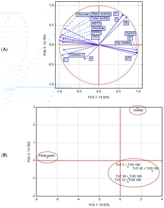 PCA confirmed a distinct influence of TUT (at a constant TOD = 180 min) on the physicochemical properties of the dehydrated raw material (Figure 6A,B). The 17 analyzed traits (TFC, DPPH, ABTS, total acidity, WL, DM, water activity, xylitol, glucose, fructose, vitamin C, and color parameters) included in the PCA allowed for the identification of three groups within the factor coordinate system, including two single-element groups ((1) fresh apple and (2) control) (Figure 6B). The first evident conclusion is the significant quality differentiation between fresh and dehydrated material. The osmotic dehydration process led to a reduction in the values of ten analyzed parameters, including TFC, ABTS, DPPH, vitamin C, and water activity. The control sample exhibited a pronounced decrease in L*, h, and vitamin C values, indicating a significant darkening and shift towards brownish hues. Simultaneously, certain color parameters, such as b*, C*, and BI, increased, reflecting an increase in yellow and color saturation, as well as an intensification of browning. These parameters were strongly negatively correlated with L* and h, further confirming the darkening and shift towards red and brown tones in the control samples. No significant correlations were observed between the color parameters b*, C*, and BI and the variables AA, pH, and dry matter content. The third group, located in the fourth quadrant of the coordinate system, consisted of samples in which the raw material was dehydrated using a xylitol solution (TOD 180 min) but had been previously treated with ultrasound (TUT 5-45). This resulted in a significant increase in dry matter content, xylitol concentration, pH, and the a* color parameter in the osmotically dehydrated material (linked to the concentration of red pigments as water is removed from the tissue). The remaining parameters exhibited either a slight (color parameters) or more pronounced (antioxidant activity) decrease. It was also observed that the dry matter content and pH of the osmotically dehydrated samples are negatively correlated with AA and TPC.