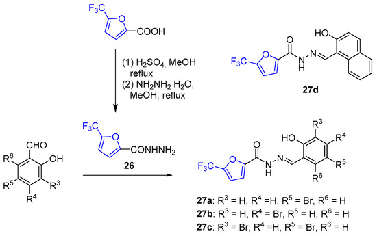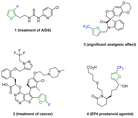 Fluorine-containing furans have been utilized in the design of drugs for treatment of various diseases [57,58,59,60,61,62,63]. For instance, β-fluorofuran derivative 1, a structural analogue of trovirdine (LY 300046), exhibits high amounts of activity against the human immunodeficiency viruses (HIV) (Figure 1) [64]. Compound 2 with a α-fluorofuran moiety is a potent and selective inhibitor of the induced myeloid leukemia cell differentiation protein MCL1 and is considered a promising candidate for targeted cancer therapy [65]. Trifluoromethylated furan subunits can often be found in novel structures for drug development and agrochemicals (examples of biologically active α-trifluoromethylated furans 3 and 4 are presented on Figure 1) [21,23,60,66]; they have also found prospective applications in various materials including liquid crystals, photoresist polymers, and self-assembling monolayers [60].