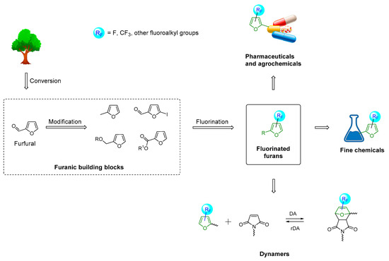 The modification of furfural into fluorinated furanic building blocks presents an intriguing approach to linking the biomass conversion with the production of fluorinated fine chemicals, advanced dynamic polymers, and pharmaceuticals (Scheme 1). Application of biobased furans as starting materials makes the production of targeted fluorinated products more sustainable and environmentally friendly in agreement with modern trends towards green chemical industry. In this perspective, we analyze the current challenges and recent advancements in introducing fluorine or fluoroalkyl functionalities into the furanic core of biobased furfural and most important derivatives. We also discuss the progress in applications of these fluorinated furanic building blocks in the development of pharmaceuticals and dynamic polymers.