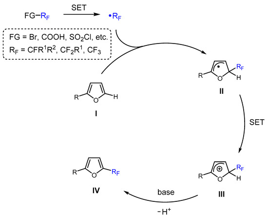 The recent methods for fluoroalkylation reactions involving furfural-derived furans can be classified into two main categories based on the mechanisms of generation and reactivity of fluoroalkyl species: (1) radical fluoroalkylation and (2) transition metal-catalyzed (cross)coupling. The mechanism of radical fluoroalkylation typically consists of three key stages (Scheme 3). The first stage involves the generation of the fluoroalkyl radical (•RF), which is a strong electrophile that readily reacts with electron-rich substrates such as furans I. These radicals can be produced from various fluorinated reagents, including halogenated fluoro-sources, fluorinated acids, anhydrides, sulfonyl chlorides, or hypervalent iodine reagents, typically through single electron transfer (SET) oxidation. In the subsequent stage, the •RF radical inserts itself into the C5 position of the 2-substituted furanic core, resulting in the formation of a fluoroalkylated furanic radical II. Finally, the rearomatization of the furan ring leads to the desired 5-fluoroalkylated furans IV. This process generally involves a one-electron oxidation of II into the corresponding furanic cation III via an SET process, followed by deprotonation (Scheme 3). Various strategies have been employed for the radical fluoroalkylation of furans, including visible-light-mediated photocatalysis and photoredox catalysis, transition metal catalysis, and alternating current electrolysis (Table 2, Table 3, Table 4, Table 5 and Table 6).