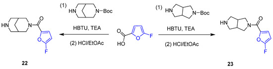 Preparation of representative fluorofurans through direct fluorination of furfural-derived substrates is summarized in Table 1. Nucleophilic fluorination via reactions with gaseous fluorine is not suitable for furan fluorination [94]. Nevertheless, some α-fluorofurans have been obtained from electron-poor furfural-derived substrates using nucleophilic fluorodenitration [78], through fluorodecarboxylation using the electrophilic fluorinating agent Selectfluor [115,116], or by employing rhodium-catalyzed heteroaryl exchange (Table 1) [117,118]. Another potential approach is the metalation-fluorination strategy, which has been effectively utilized for fluorination at both the α- and β-positions of the furan ring [119,120,121].