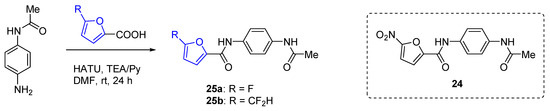 Fluorinated and fluoroalkylated furans may serve as valuable synthetic intermediates. While numerous methods for the nucleophilic or transition-metal-catalyzed defluorinative C−F bond functionalization of fluorinated heterocycles are reported [67,68,69], information regarding the application of these methods for modifying fluorine-functionalized furans is limited [70]. On the other hand, the high electronegativity of the fluorine atom can make the adjacent C–H bond in a furan ring more susceptible to nucleophilic attacks that may facilitate the transformation of fluorine-containing furans into more complex fluorinated structures [71,72]. Furthermore, fluorofurans and fluoroalkylfurans can be utilized as building blocks for synthesizing non-furanic cyclic or acyclic compounds [73].