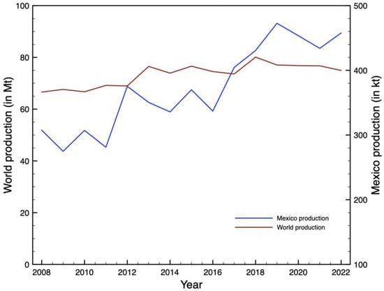 World and Mexico grape production from 2010 to 2022, with data from FAO and SIAP [4,5].