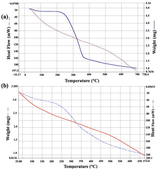 As shown in Figure 2a, the first increment analyzed, ranging from 0 to 100 °C, was related to the evaporation of H2O. Once the moisture was removed from the sample, the mass loss remained relatively constant from 100 to 220 °C. After 220 °C, a pronounced decline began, extending up to 350 °C, attributed to the hemicellulose decomposition in the range of 150–310 °C [18]. Above 350 °C and until the end of the test, a constant decline was observed again, indicating cellulose and lignin decomposition between 310 and 400 °C. In Figure 2b, the thermogravimetric analysis of grape pomace began with moisture removal up to 100 °C. The next section, from 100–250 °C, shows the removal of extractable compounds, followed by the hemicellulose decomposition zone between 250 and 350 °C. Beyond this point, two trends were observed: from 350 to 500 °C, cellulose decomposition occurred, and above 500 °C, lignin decomposition predominantly took place in the biomass [18].