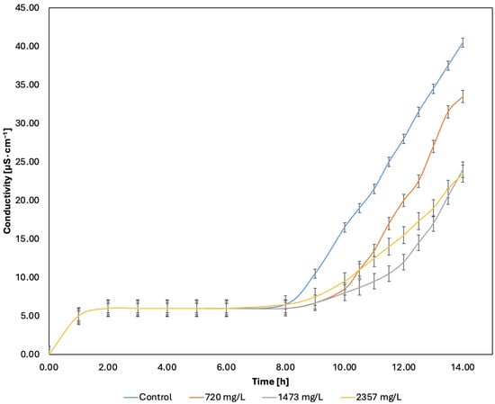 At 14 h, the lowest conductivity value recorded was 23 µS∙cm−1, reflecting a 42.5% reduction from the original sunflower oil value. The four curves are shown in Figure 3.