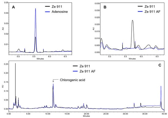 Identification and removal of adenosine from Ze 911 by UPLC. (A) Identification of adenosine in Ze 911 by UPLC with PDA detection at 254 nm. (B) Overlayed chromatogram demonstrating the absence of the adenosine peak in the Ze 911 AF, confirming the successful removal of adenosine. (C) Qualitative comparison of the native and adenosine-free Ze 911 extracts using UPLC-PDA at 254 nm, showing no significant differences in the chromatographic fingerprints.