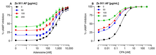 Effect of adenosine-free Ze 911 extract on A1AR agonist-mediated cAMP inhibition in CHO-K1-hA1R cells. CHO-K1 cells stably expressing the human A1 adenosine receptor (hA1R) were co-stimulated with forskolin (1 µM) and increasing concentrations of adenosine (A) or CPA (B) in the presence of different concentrations of adenosine-free Ze 911 extract (Ze 911 AF). (A) Increasing concentrations of Ze 911 AF (50, 100, and 200 µg/mL) progressively enhanced adenosine-induced cAMP inhibition, increasing the maximal response, indicating positive allosteric modulation. (B) Similar results were observed with CPA, where Ze 911 AF enhanced CPA-induced cAMP inhibition in a concentration-dependent manner. Data points represent the mean ± SEM of at least three independent experiments conducted in duplicate. In cases where the SEMs are not visible, they are smaller than the symbol used.