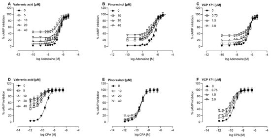 Positive allosteric modulation of adenosine (A–C) or CPA (D,E) responses by the test compounds. Effects of valerenic acid (A,D), pinoresinol (B,E), or VCP 171 (C,F) on cAMP inhibition. Each test compound was assessed at various concentrations to evaluate their potential positive allosteric modulation (PAM) properties. Data represent the mean ± SEM of at least three independent experiments conducted in duplicate. In cases where the SEMs are not visible, they are smaller than the symbol used. Curves through the data represent the fit of an operational model of allosterism [28].