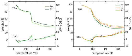 Regarding the TGA analysis, it is observable that the degradation of the non-crosslinked CMC films, F0 and F2, is completed in three steps, which are also described in the literature [42,46]. In the first degradation step (30–115 °C), due to the loss of absorbed water, both F0 and F2 exhibit a weight loss of 15%. The second degradation step occurs when a temperature of 274 °C is reached, and it is attributed to the degradation of the side chain of the CMC polymer and the loss of CO2. This is the most prominent degradation step, consisting of a weight loss of 30% and 25% for F0 and F2, respectively.