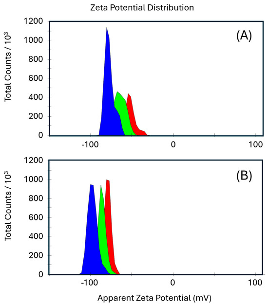 The analysis of the electrokinetic properties and stability revealed that the apparent zeta potential (ZP) is a key parameter for assessing the surface charge of particles in suspension, directly impacting the colloidal stability of the matrix. Studies have shown that modifications to CMC can substantially alter its ZP, thereby affecting its ability to interact with other components [49,50]. In this context, the ZP distribution graphs (Figure 3) indicate an improvement in the uniformity of the particle population upon the addition of EB (CMC–EB). In contrast, CMC exhibits a broader and less homogeneous distribution. This suggests that the presence of EB facilitates a more even redistribution of surface charges, enhancing electrostatic stabilization and improving colloidal dispersion. These findings were further corroborated by electrophoretic mobility and ZP measurements.