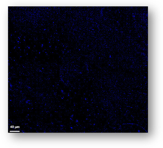The selected vibrational mode of EB at 430 cm−1 enters in resonance with the beat frequency—the difference between the energy of the two laser beams ϖpump and ϖStokes—and the spots where a strong anti-Stokes signal at (ϖpump − ϖStokes) + ϖpump are represented in a false color in the microscope image, making it possible to observe the EB particles, in this case also in bright blue, dispersed in the crosslinked CMC matrix, as shown in Figure 4. As all the other vibrational modes are off-resonance, no signal is produced by them.