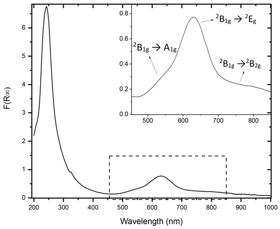 The optical absorption spectrum of the EB powder was recorded in diffuse reflectance mode, and the Kubelka–Munk function is shown in Figure 5. The absorption bands at about 784, 629, and 549 nm, corresponding to three different electronic transitions, namely 2B1g →2B2g, 2B1g → 2Eg, and 2B1g → A1g, respectively, are attributable to Cu2+ ions under D4h symmetry [9,27,28], while the absorption band at 242 nm is related to the transition from the valence band to the conduction band [26].