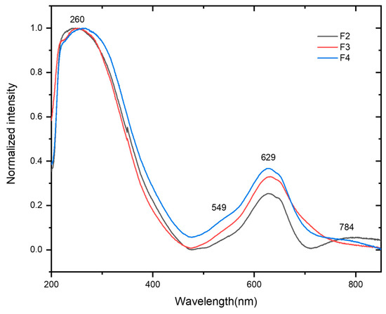 UV–Vis absorption spectra of non-crosslinked carboxymethylcellulose (CMC–EB) (Egyptian blue) (F2) and citric acid (CA)-crosslinked (CMC–EB-CA) (F3 and F4) films.