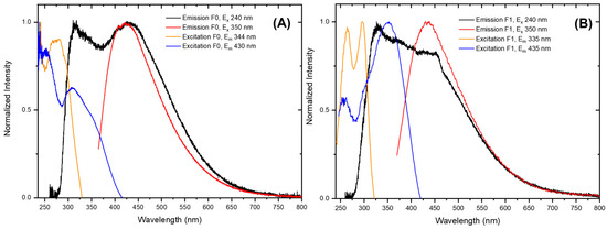 Normalized emission (A) and excitation (B) spectra of carboxymethylcellulose (CMC) (F0) and citric acid (CA)-crosslinked (CMC–CA) (F1) films with different wavelengths.