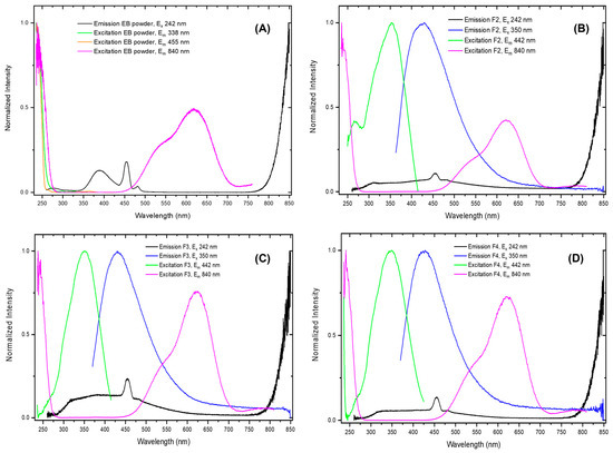 Normalized emission and excitation spectra of Egyptian blue (EB) powder (A) and of F2 (B), F3 (C), and F4 (D) films.