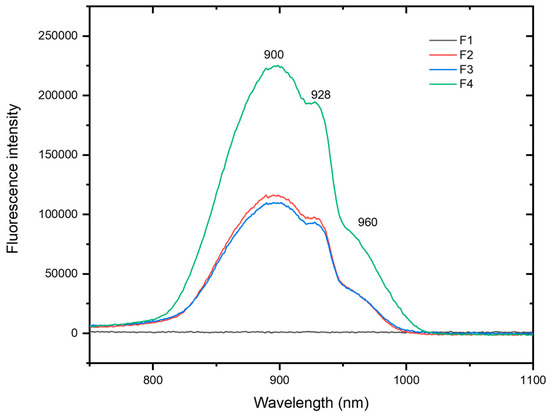 To ensure that the NIR emission of EB was maintained after incorporation in the CMC matrix, fluorescence spectroscopy in the NIR region was recorded. Upon excitation at 630 nm, which corresponds to the 2B1g → 2Eg absorption band of Cu2+ [9], a broad emission band centered at 900 nm is observed in Figure 9. Moreover, two shoulder bands at 928 nm and 960 nm are also observed. As expected, the CMC film with 3% content of EB (F4) is the one that presents the highest intensity of emission, whereas the crosslinking does not seem to significantly affect it (F3 compared with F2).