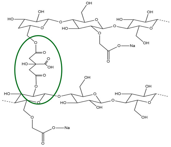Carboxymethylcellulose (CMC) chains crosslinked with citric acid (CA) are circled in green (chemical structures drawn using ChemDraw Ultra 12.0 software).