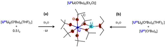 The heterobimetallic uranium(V) tert-butoxide [ULi(OtBu)6(Et2O)] was synthesized via two distinct redox pathways, as reported by Hayton et al. [16]. It was successfully obtained via (a) oxidation of [ULi2(OtBu)6(THF)2] with elemental iodine in diethyl ether, and (b) comproportionation of [ULi2(OtBu)6] and [U(OtBu)6] [16].