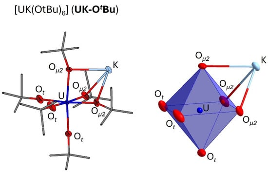 The uranium(V) centers in the molecular structures of UM-OtBu (M = Na, K, Rb) were coordinated by six tert-butoxide ligands, displaying a distorted octahedron. Unlike the [LiU(OtBu)6(Et2O)] complex reported by Hayton et al. (Figure 1) [16], in which the coordination environment differed significantly, the U(V)M(I) compounds presented in this study exhibited distinct binding motifs, where three ligands bound terminally to the U(V) center, while the remaining three adopted a μ2-bridging mode to the alkali metal M(I) cation (Figure 3 for UK-OtBu). The molecular structure featured a trigonal bipyramidal [UMO3] framework, where one uranium center, one alkali metal center, and three μ2-bridging tert-butoxide ligands occupied the vertices of the trigonal bipyramid.