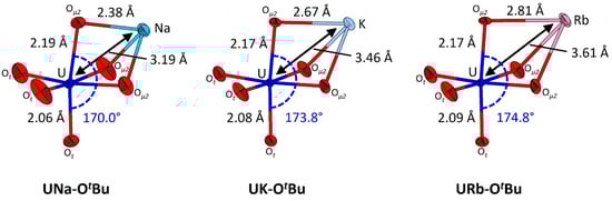 The AnMO6 frameworks of the [AnM(OtBu)6] derivatives (UM-OtBu-type (M = Na, K, Rb)) with the corresponding An–M distances, the Ot–An–Oμ2 (trans) angles, and the An–Ot and An–Oμ2 bond lengths.